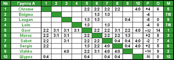 | Поиграли, теперь можно заняться аналитикой. Судьба первых трех мест решится в дуэли Vlahko-Chrome. Победа Хрома, скорее всего, не сможет повлиять на победный финиш Vlahko, который стабильно не терял очки в матчах со слабыми(как сказал бы Мороз - не вышедшими на пик формы) противниками, однако почти наверняка повлияет на судьбу второго места. Ведь в этом случае Хрому останется выиграть все оставшиеся матчи с разницей не меньше +8, что сделать не так уж и сложно. Если же Хром проиграет дуэль Vlahko, то может скатиться и на 4ое место, в случае безошибочной игры Мороза в последних двух матчах. Не утратил шансы на медаль и Сабот, но это уже из области ненаучной фантастики. Борьбу за последнее место пока с неплохим отрывом достается Шурке, но ничья с кем-нибудь из утративших турнирную мотивацию игроков поднимет ее резко вверрх. Тем более, что нам еще предстоит увидеть дерби с участием аутсайдеров: Шурки, Логана, Лоина и Энигмы. Sergio же утратил все шансы и на медаль и на возможность занять последнее место.